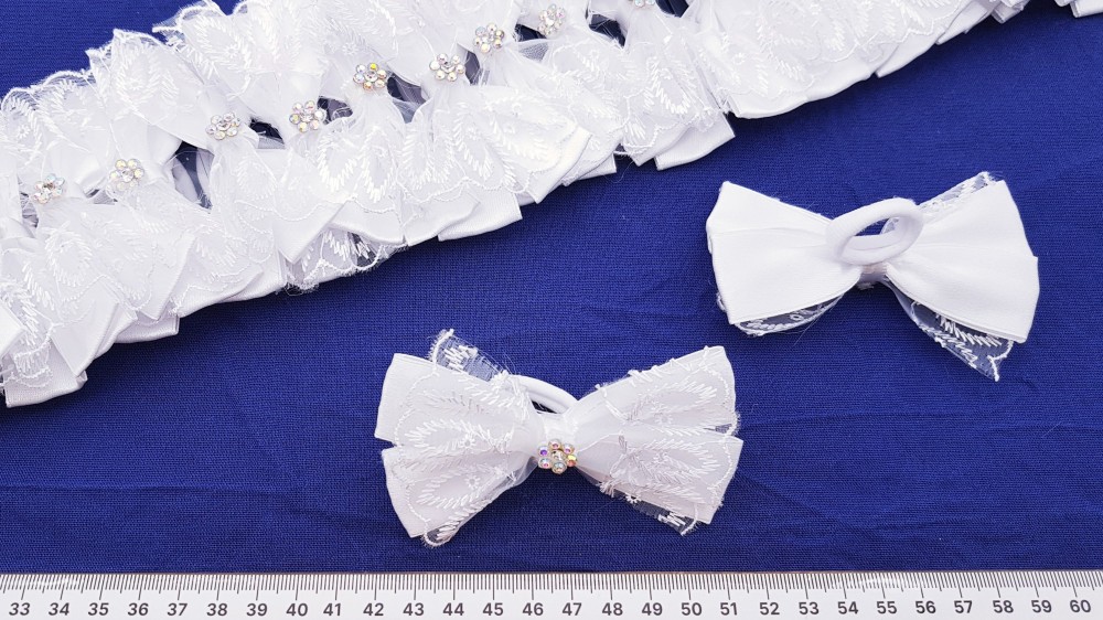 Атлас, кружево, страз, нейлоновая резинка. Бант 10 на 5 см. Резинка 2,5 см