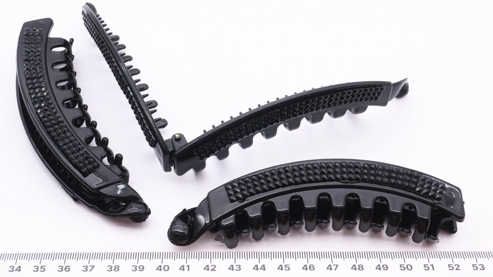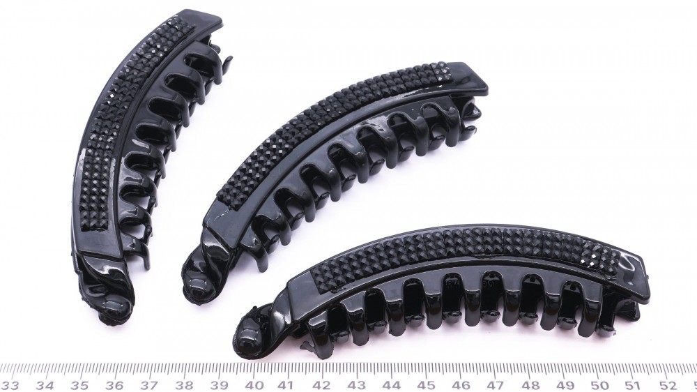 Глянцевый пластик, стразы. Длина 13 см., ширина 2,5 см