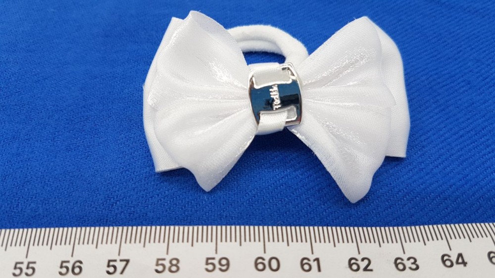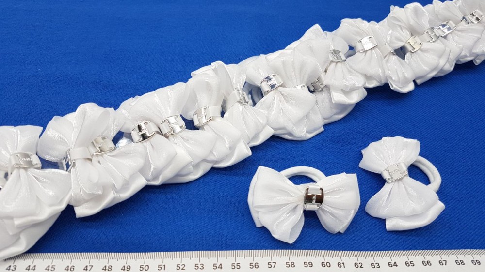 Атлас, металл, пластик, нейлон. Резинка 3 см, ширина 0,9 см. Бант 6 см.на 4 см