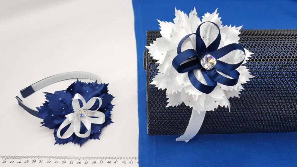Ободок 1,5 см. Бант из резного атласа 10 см со стразами, цветочек из ленты 8 см, квадратный страз.  Синий и белый