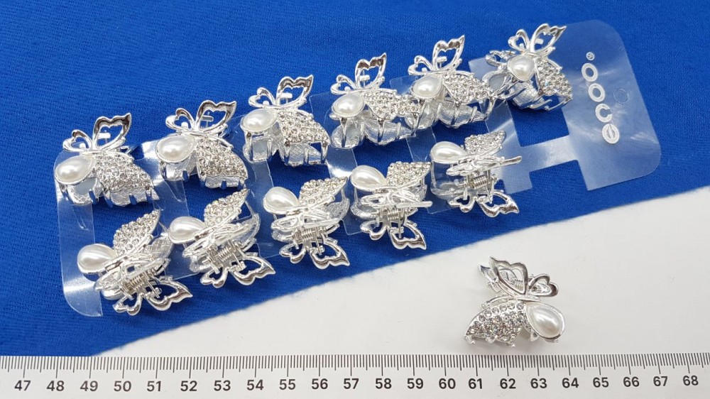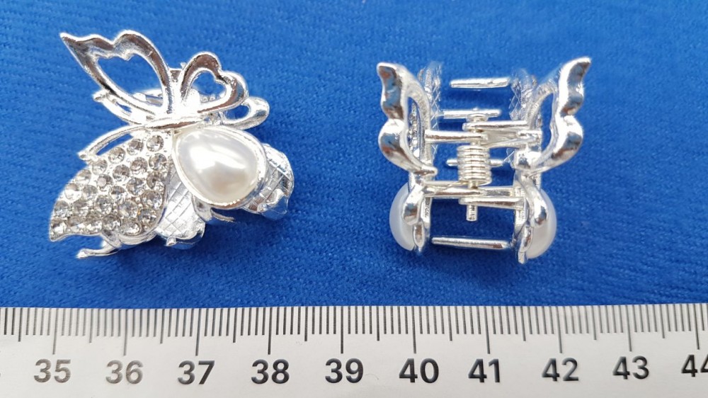Краб для волос металл GB-08 серебро бабочка стразы, жемчуг 3 см