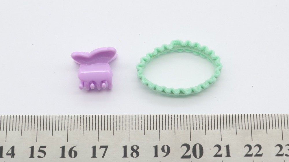 Пластик, нейлон, металл. Набор: 10 крабов по 1,5 см., 5 резинок по 2,5 см.