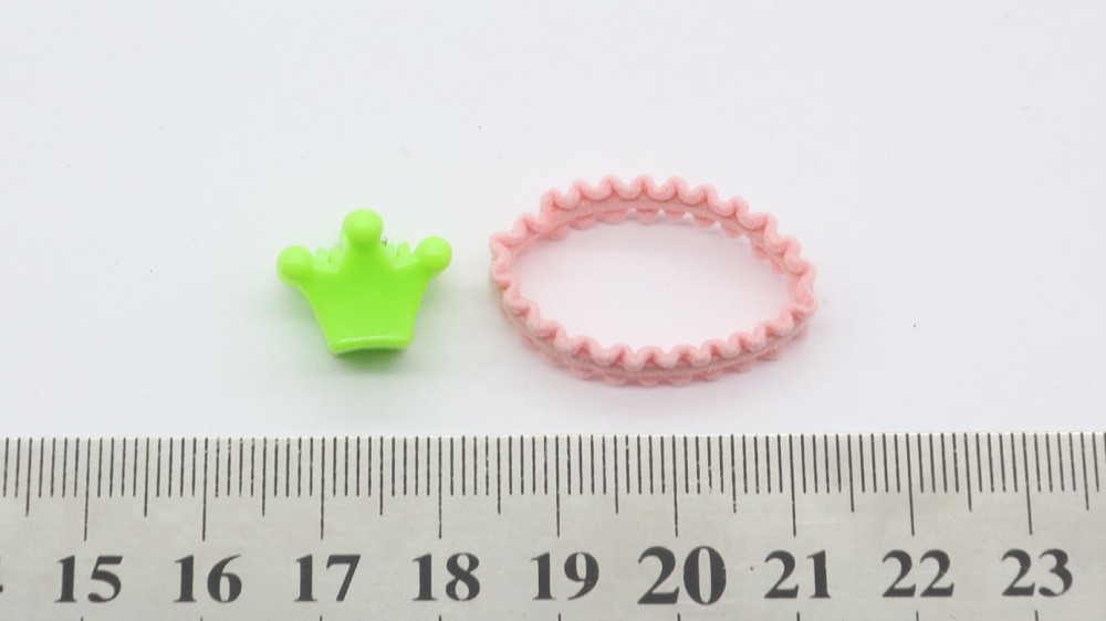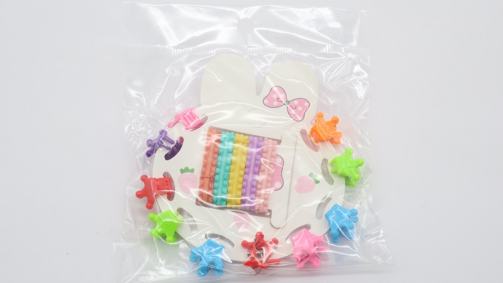 Пластик, нейлон, металл. Набор: 10 крабов по 1,5 см., 5 резинок по 2,5 см.