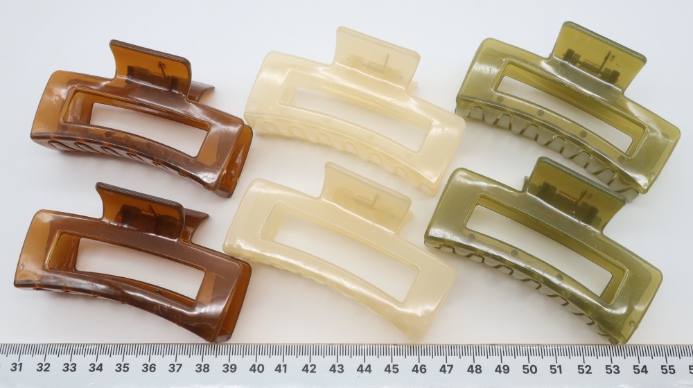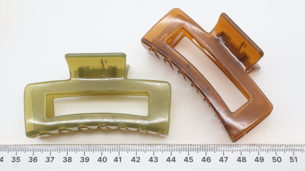 Глянцевый полупрозрачный пластик. Длина 8,5 см, высота 4,5 см, золотая пружина.