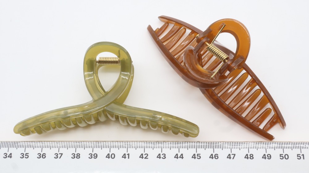 Глянцевый полупрозрачный пластик. Длина 11 см, высота 6 см, золотая пружина.