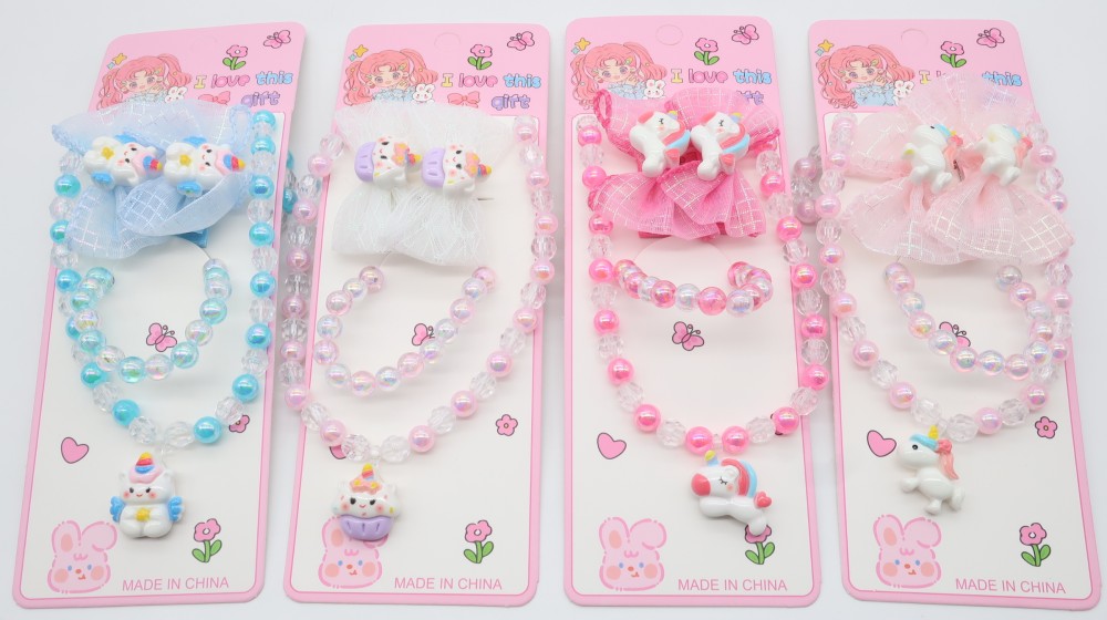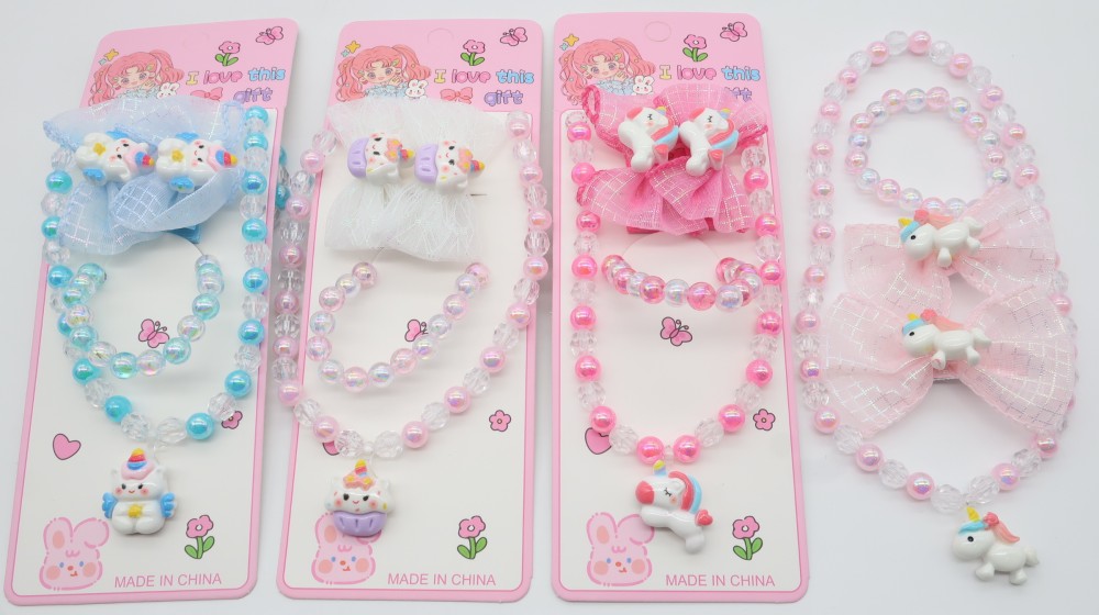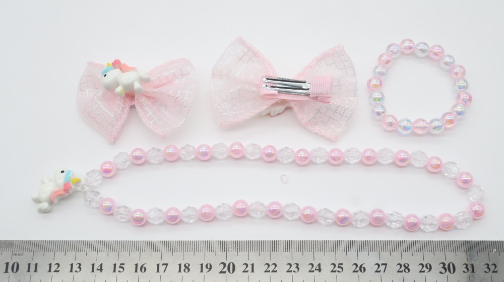 Пластик, жемчуг, ткань, резинка. Набор: бусы, браслет, 2 зажима