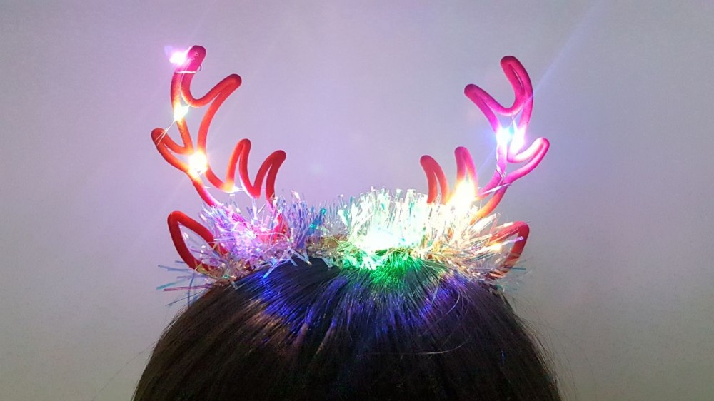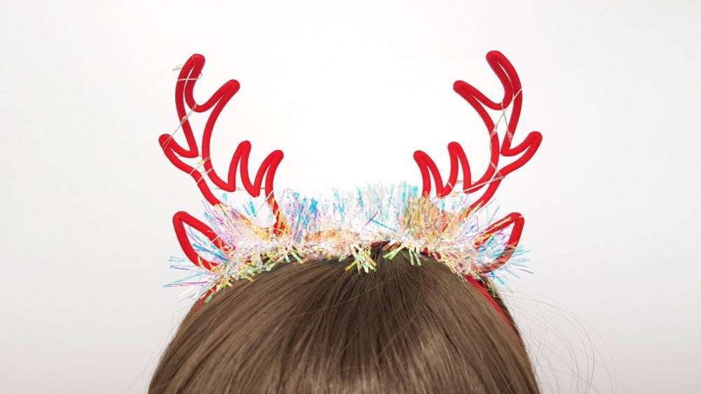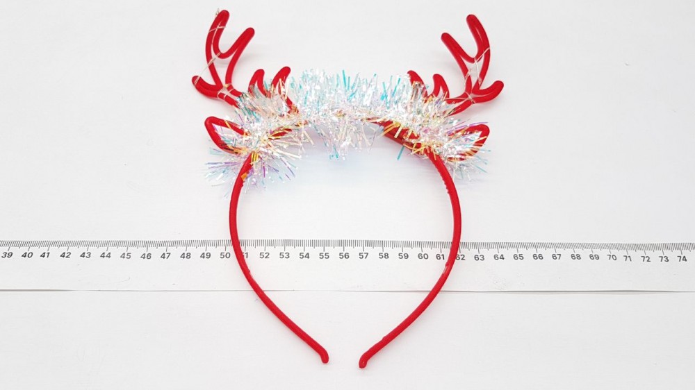 Пластик, бархатное напыление, мишура. Рожки 8 см. Светятся при нажатии кнопки.