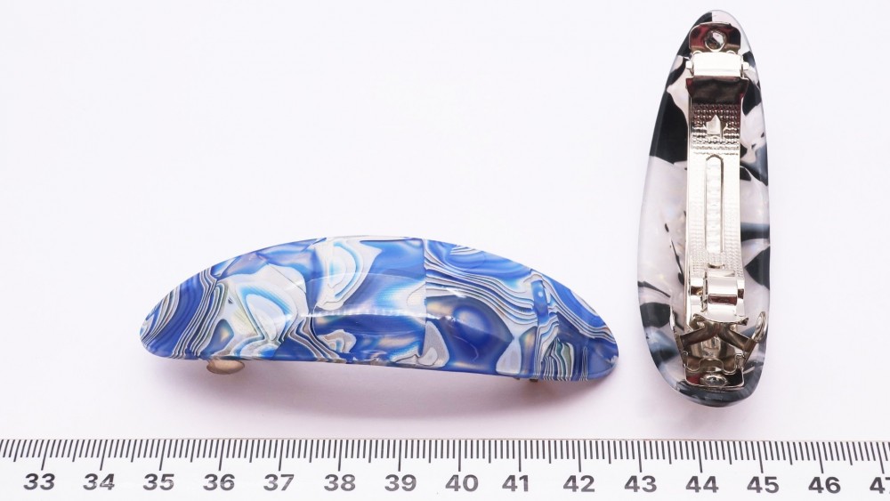 Глянцевый пластик, металл. Длина 9 см., ширина 2,5 см.